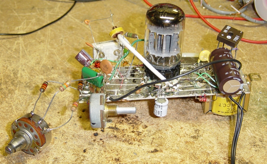 The unusual-looking breadboard is homebrew. I took a piece of plain PC board, and etched the pattern with a small, pointy file. Then I tinned it with solder, added the socket and then the components. The cathode resistor of the pentode was done by "lifting" the tube socket's pin from the board, and putting the R between the pin & the board. This simplified the rest of the layout, as I could use the larger foil area as a convenient ground.