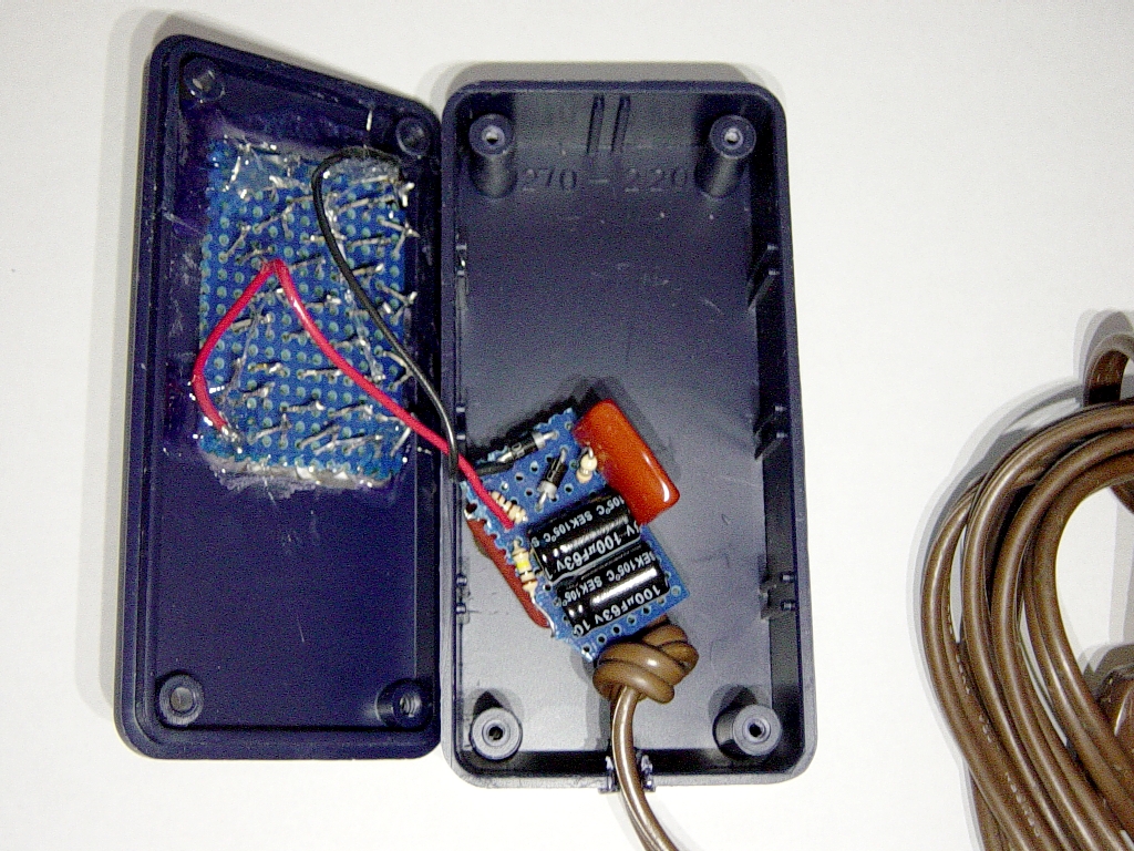I don't remember the brand name, but these night lights use a circuit that is self current-limiting. Thus, it can power a string of any number of LED's from 1 to 40! (The night lights use ONE LED. I modified several of them to use TWO, and one unit in the hallway now uses FOUR!) This circuit is quite ingenious, in that it uses a .68 capacitor as a voltage dropping element. This also serves to limit the current to about 12ma into one LED, and 8ma into this string of 36. Why 36? Because it comes out to 104v, and it's an even number. :) Plus, I had already assembled this array, and didn't want to modify it further.